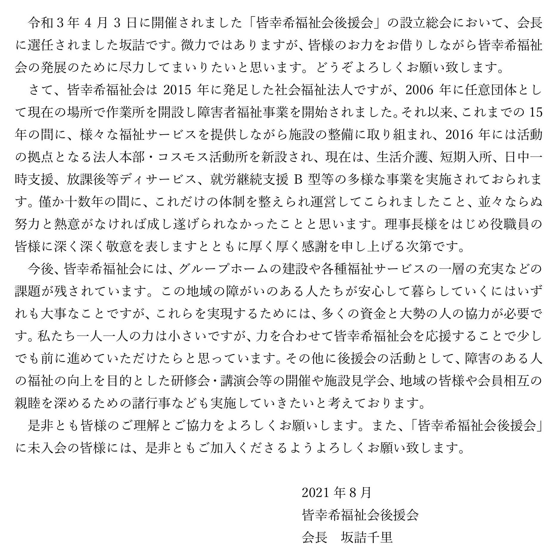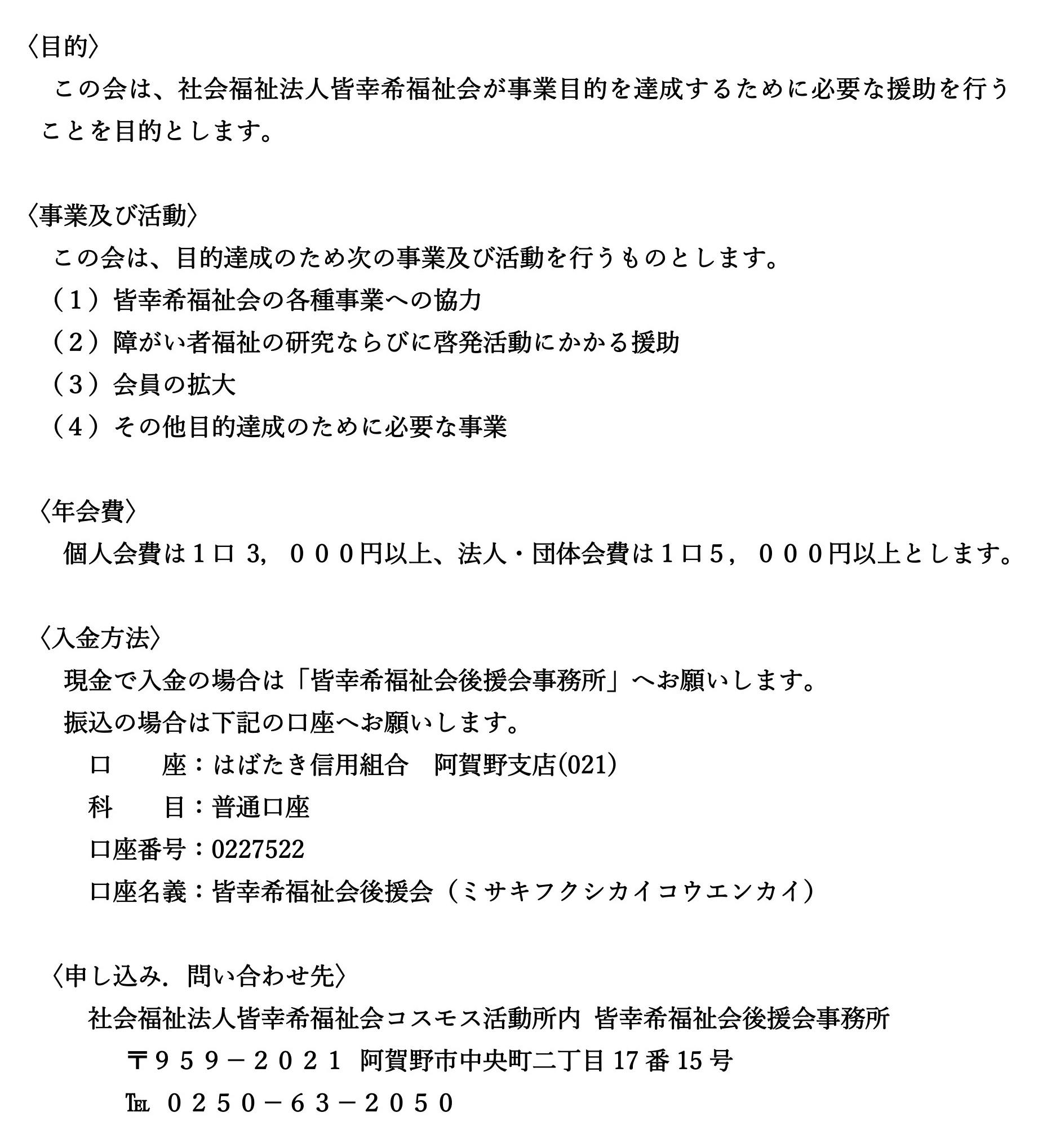 当後援会は皆幸希(みさき)福祉会を支援する活動を行っています。